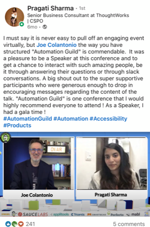 I would highly recommend Automation Guild as a great way to learn new things and network with other testing professionals.